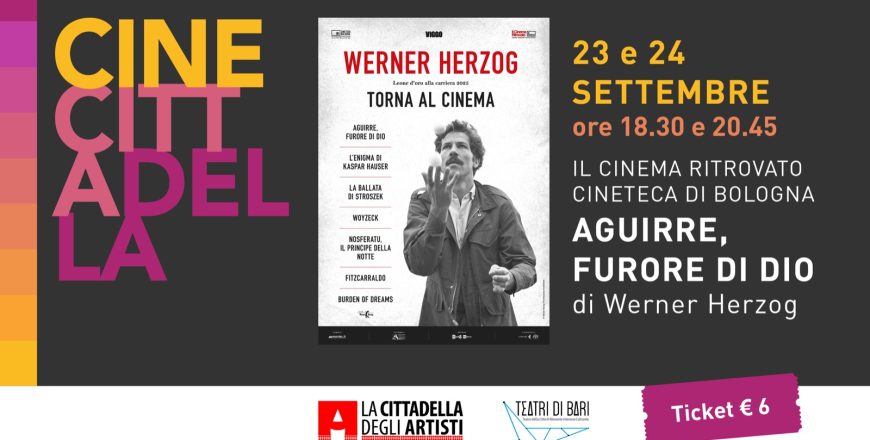 Secondo appuntamento autunnale per Cine Cittadella, le proiezioni cinematografiche alla Cittadella degli artisti di Molfetta. Questa settimana è in programma un omaggio al regista tedesco Werner Herzog, voce unica, libera, potente del cinema internazionale. Doppia proiezione martedì 23 e mercoledì 24 settembre, alle ore 18.30 e 20.45, per Aguirre, […]
