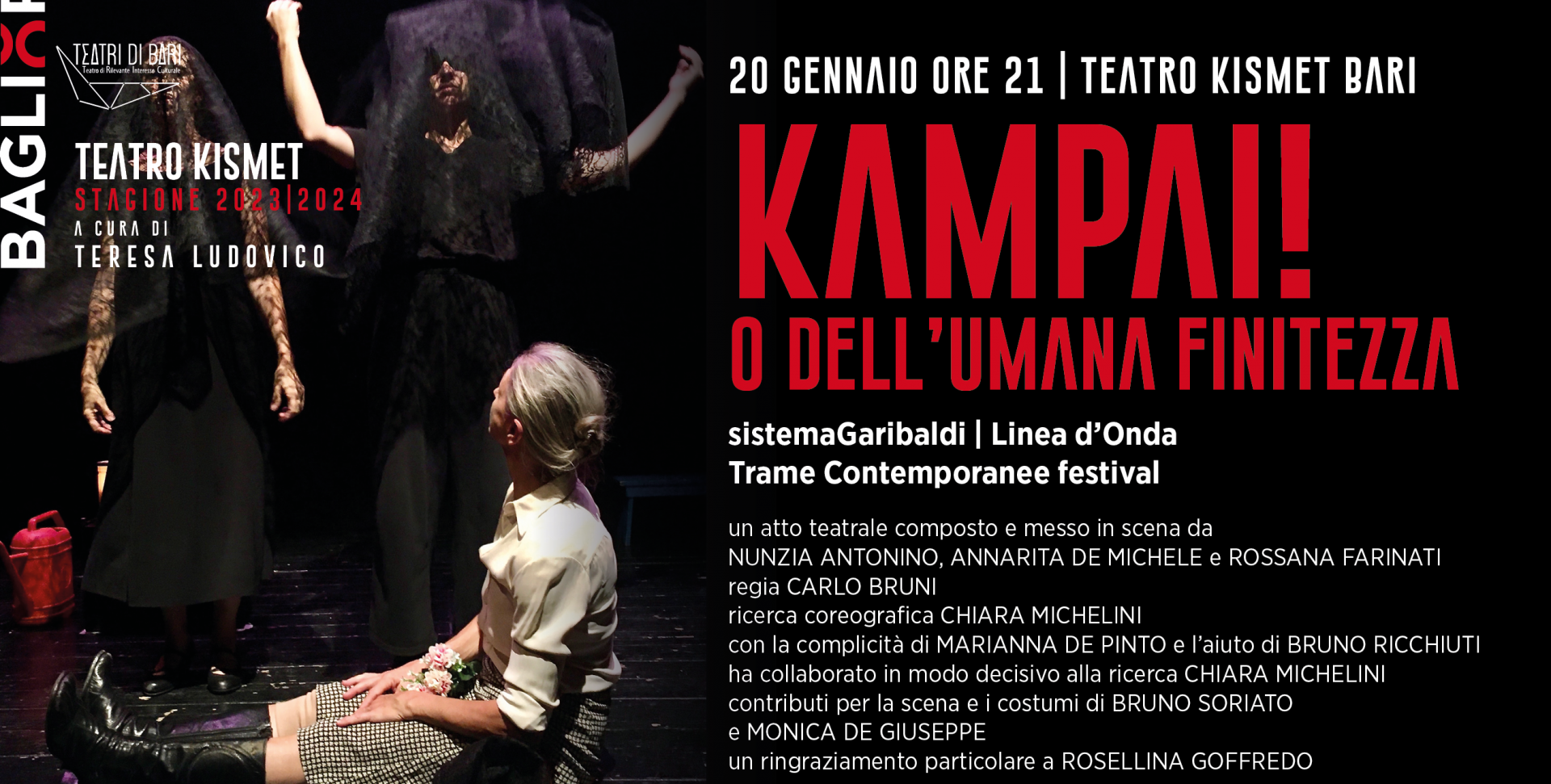 Così è nato il titolo Kampai che include la k, richiamando l’esclamazione con cui i giapponesi brindano “alla vita” e l’aver campato, l’aver vissuto: obiettivo non scontato per nessuno. I nostri personaggi – tre figure femminili – disegnano quella minima geografia necessaria all’evocazione del commiato.